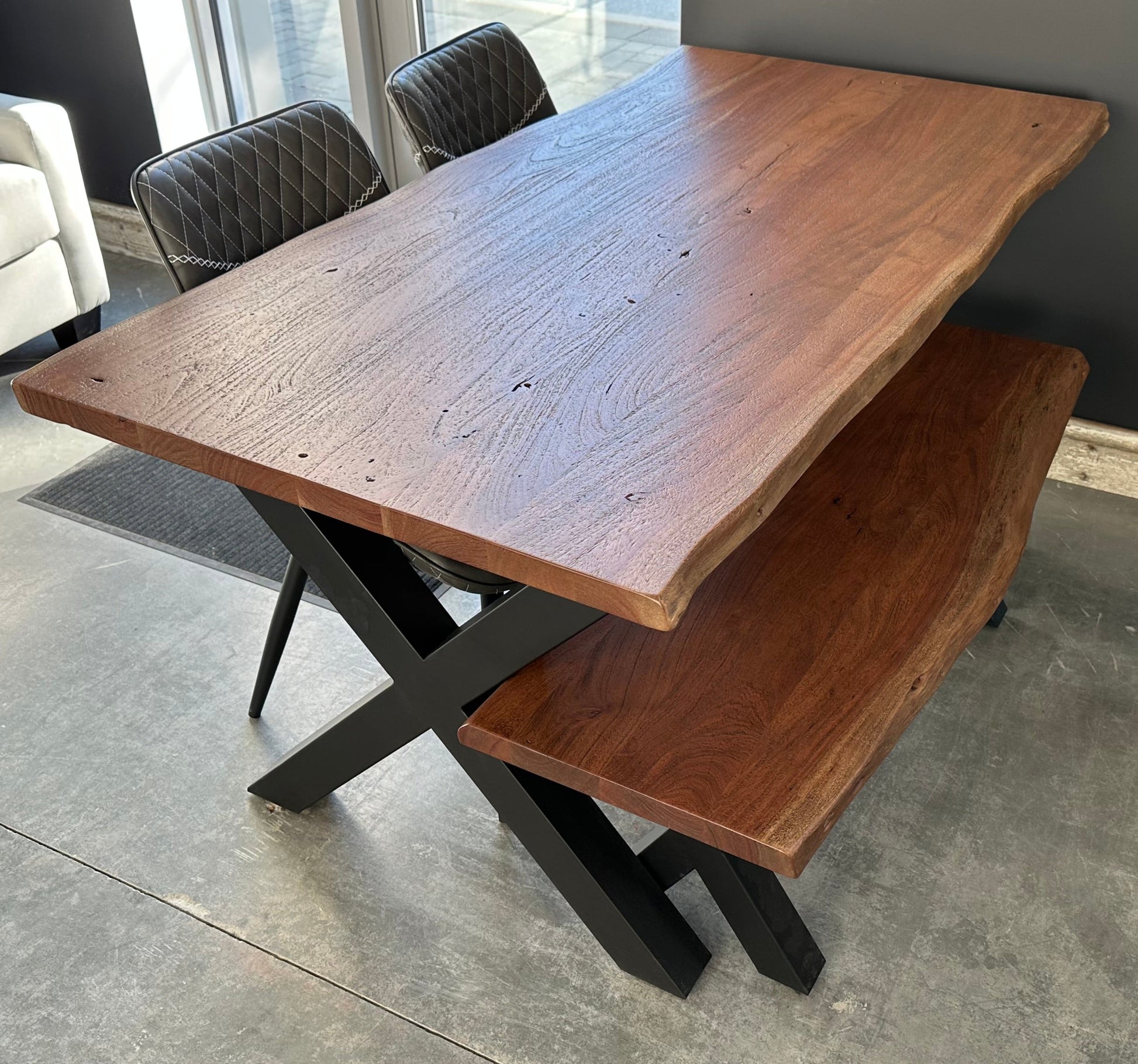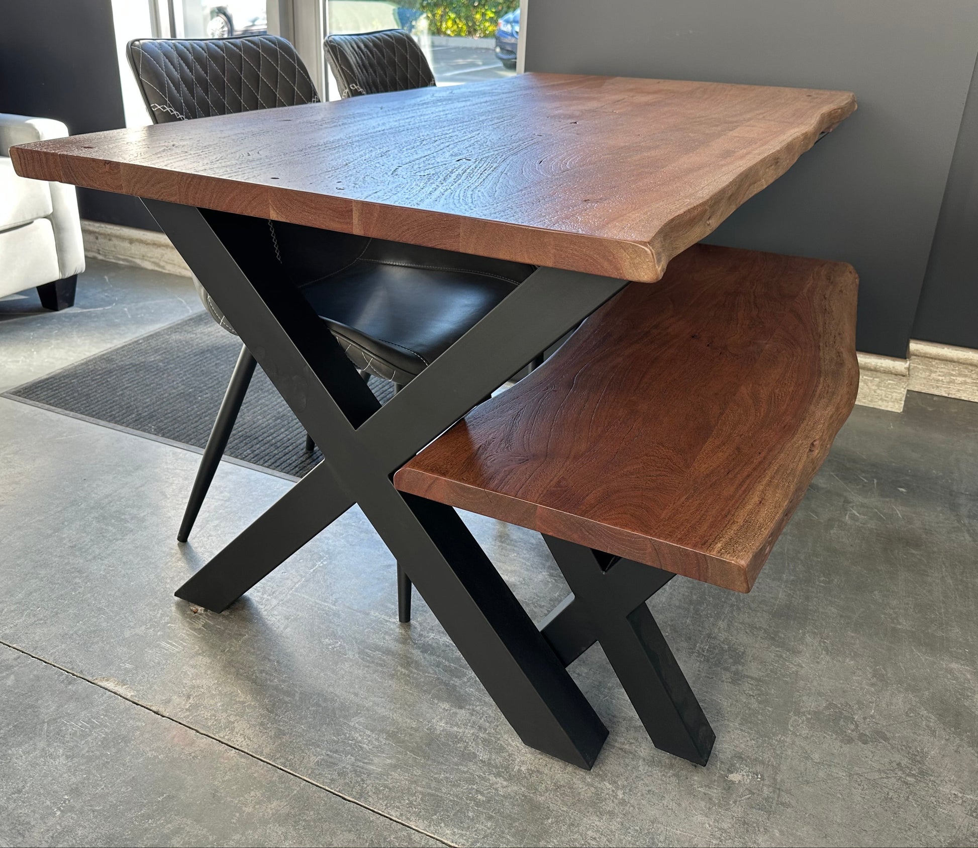 Hands down, The Calcutta Collection is our most popular Live Edge Collection. Shown in a matte Natural Finish, or matte Sandblasted Walnut Finish on 100% Solid Acacia Wood, these meticulously crafted Dining Tables are manufactured to the highest quality standards in the industry. Each Dining Table will be one of a kind and may have some unique markings, knots, fissures and very small surface cracks in the wood. These Dining Tables are a Masterpiece! We call this the "Legendary Collection" because these Dining Tables are just that good.