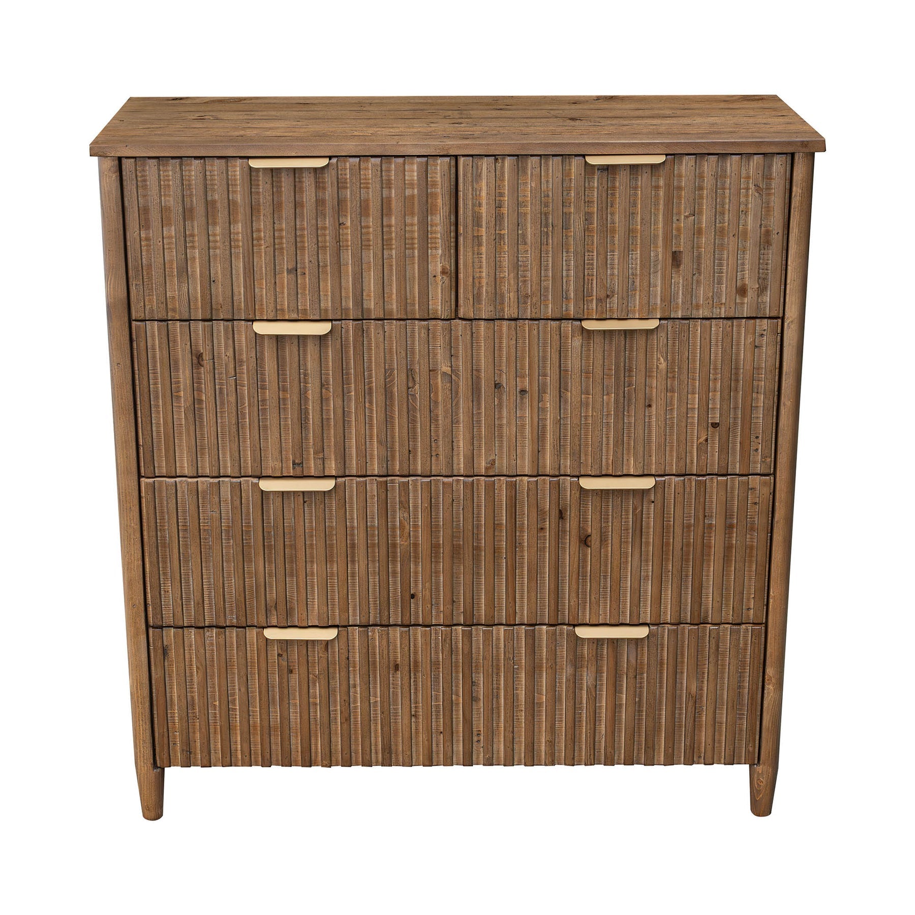 This Chest of Drawers brings a modern rustic aesthetic to any bedroom with its spacious design and thoughtful craftsmanship. Crafted from 100%, sustainably sourced FSC recycled Pine, this chest features a slatted texture across its front drawers, adding a rustic yet refined touch.