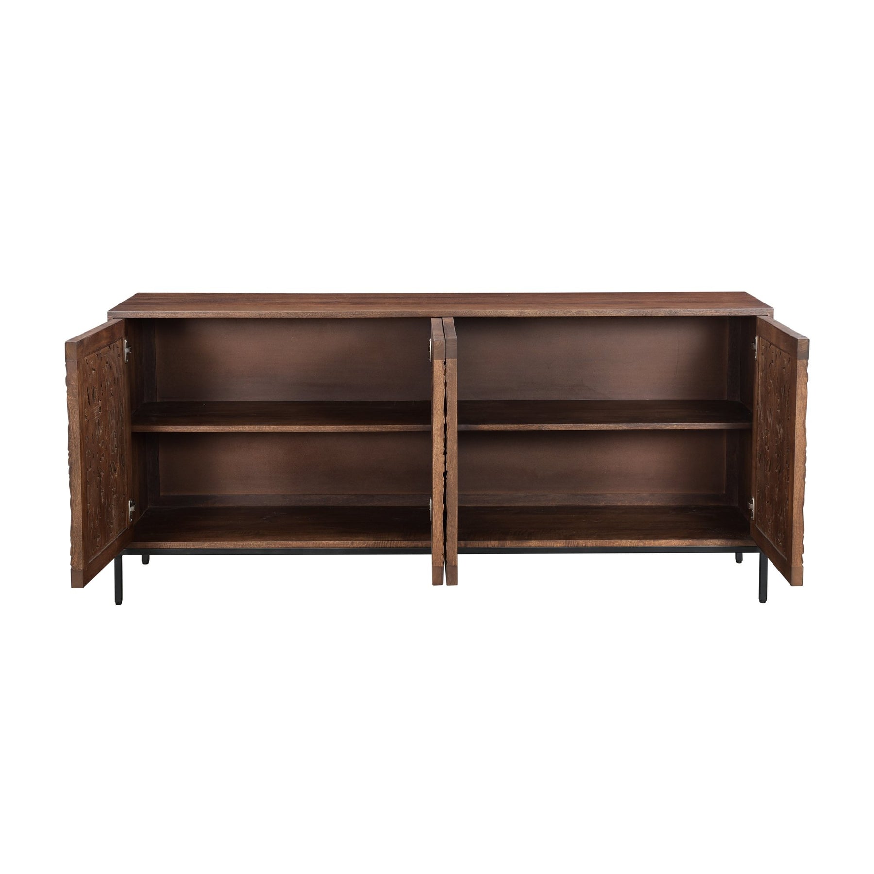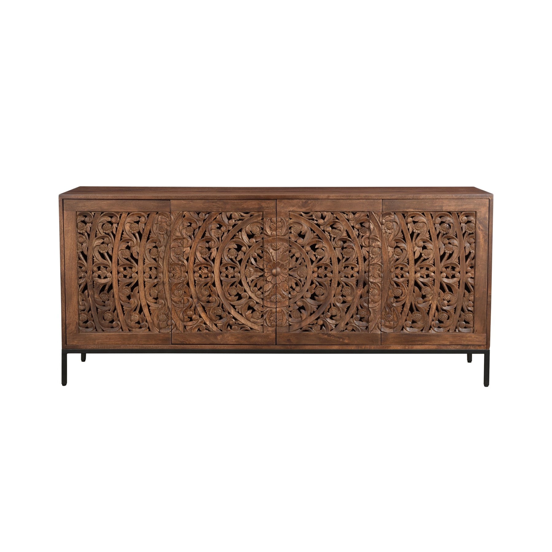 Unique and intricate floral designs pattern the front of this distinctive sideboard. The mango wood used in the construction is treated to have a rich, walnut brown finish that retains the textures of the wood. With a sturdy iron frame for stability, this piece is perfect as storage and as decoration.