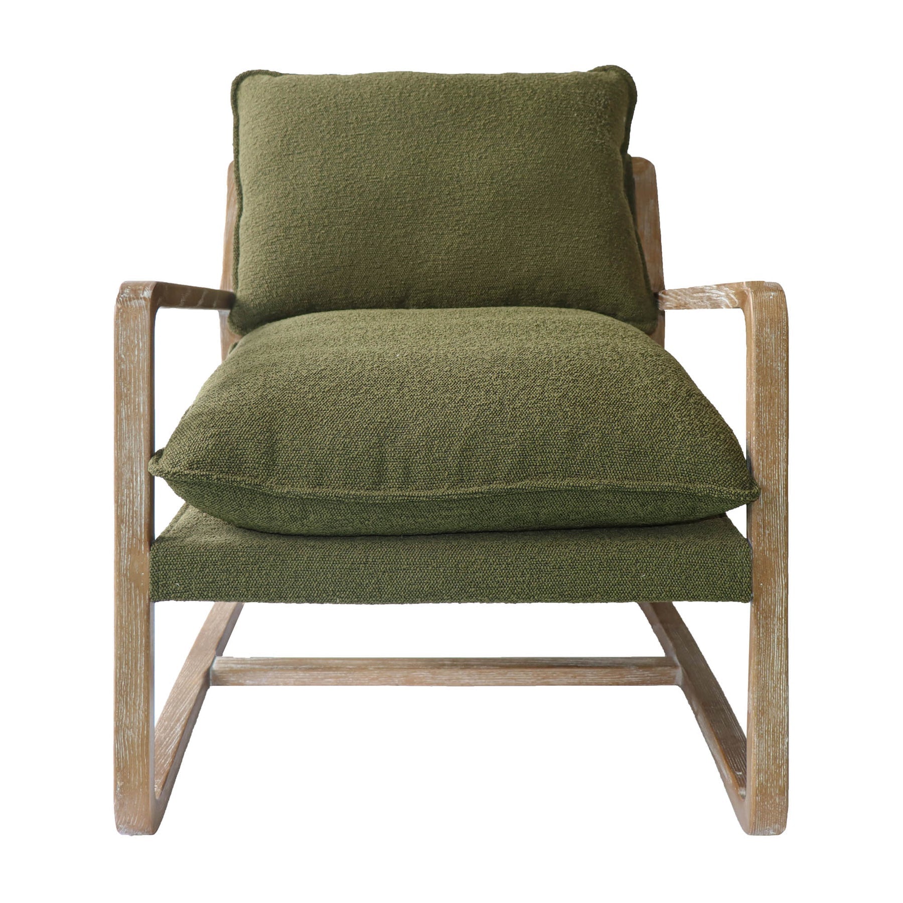 The perfect club chair to relax or curl up with a good book. Enjoy a chill afternoon with this ash wood frame that supports a deep low-style seating covered in moss green boucle fabric.